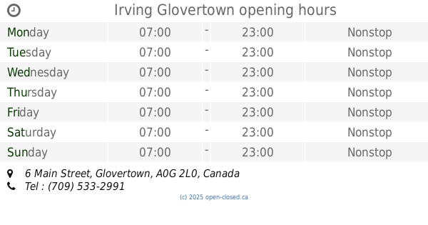 It is also possible to : Edit these OPENING HOURS of Station Irving In Glovertown, 6 Main Street,
